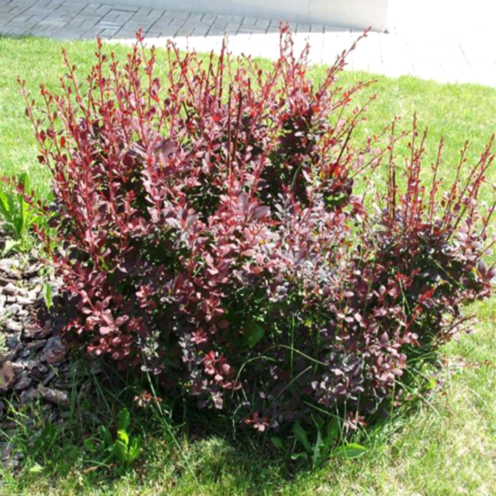 Барбарис оттавский Суперба - красивый крупный раскидистый кустарник. Быстрорастущий. Своих окончательных размеров достигает за 8-10 лет. Подходит как для одиночной, так и для групповой посадки с другими многолетниками, а также для создания живых изгородей. Рекомендуется как цветовой акцент в древесно-кустарниковых композициях. По виду растение похоже на пурпурнолистную форму барбариса обыкновенного, но немного крупнее. Крона раскидистая, довольно крупная, с длинными годовыми приростами. Изначально вертикальная, с возрастом дугообразно поникающая. Кустарник даёт многочисленные побеги с крупными колючками. Листья округлые до 3-5 см в длину, пурпурно-фиолетовые с металлическим оттенком летом. Осенняя окраска листьев – ярко-красная, однако окрашивается зачастую не весь куст. На солнечном месте окраска листьев более насыщенная. Цветки жёлтые с красной отметиной, собраны в кистевидные соцветия по 10 штук. В длину – до 5 см. Обладают сильным ароматом. Время цветения - май. Плоды ярко-красные.