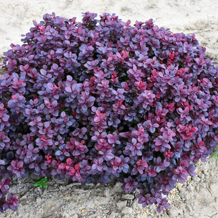 Барбарис Тунберга Конкорд — это компактный листопадный колючий кустарник, достигающий в высоту максимум 0,6 метра. Его побеги растут близко друг к другу, создавая густую и шаровидную крону. Ветви растения покрыты острыми колючками, что придаёт ему дополнительную защиту. Растёт барбарис очень медленно, за один сезон увеличивая свою длину всего на пару сантиметров. Это делает его идеальным выбором для занятых садоводов, которым не нужно тратить много времени на уход за кроной. Листья кустарника имеют овально-яйцевидную форму и меняют свой цвет в течение сезона. Вначале они розовые, а затем становятся пурпурно-фиолетовыми. Цветки барбариса обладают приятным жёлтым оттенком и насыщенным ароматом, который можно ощутить даже на расстоянии. Ягоды барбариса достигают диаметра 1 см и созревают поздней осенью, приобретая насыщенный красный оттенок. Их форма может быть вытянутой или овальной, а вкус — приятным. Бутоны начинают распускаться уже в апреле-мае. Барбарис Тунберга Конкорд нетребователен к почвам, устойчив к городским условиям и хорошо поддаётся стрижке. Он отлично подходит для групповых посадок, композиций с хвойными растениями, а также для создания рабаток и бордюров. Прекрасно смотрится среди камней в каменистых садах и на альпийских горках. Зимостойкость зона 4 (до -34ºС).