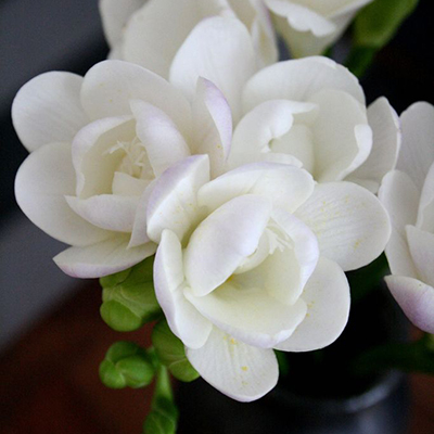 Фрезия махровая белая – элегантное, роскошно цветущее растение с нежным, восхитительным ароматом, особо ценится в садоводстве. Фрезия представляет собой невысокое растение на довольно тонком стебле с одиночными или образующими соцветия цветками. Цветки нежного белого цвета с желтой сердцевиной, лепестки аккуратные, сужающиеся к кончикам. Период цветения: апрель-сентябрь. Очень любят солнечные, теплые участки и рыхлую, питательную почву с минимальным количеством удобрений. Фрезия не переносит холод, поэтому с наступлением холодов клубни нужно выкопать и хранить в тёплом месте в капроновых чулках. Фрезию успешно выращивают, как комнатное растение, может зацвести в любом месяце - зависит от того, когда будет посажена луковица. Для получения цветов домашней фрезии, клубни высаживают в конце лета.