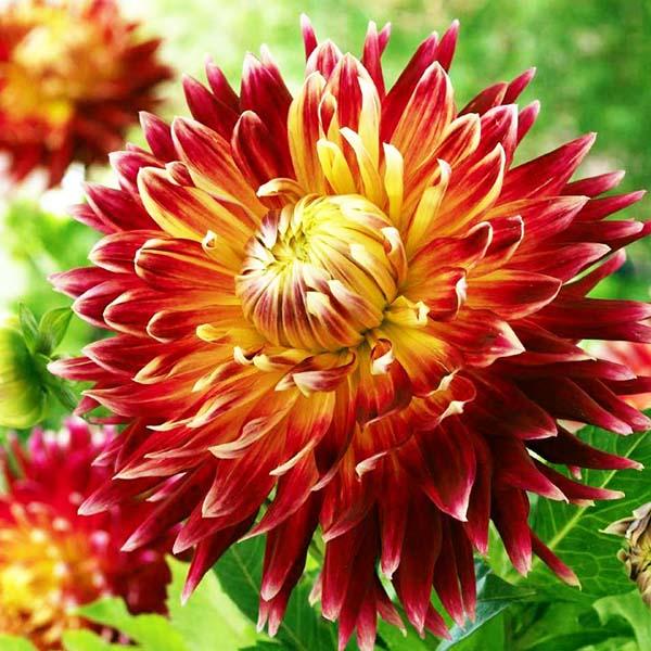 Георгин Акита — яркий, эффектный сорт, который моментально притягивает внимание благодаря насыщенным огненно-красным тонам с золотисто-жёлтым центром. Узорчатые, слегка загнутые лепестки создают живую динамику, а крупный размер цветка делает растение настоящей звездой цветника. Куст высокий, мощный, с крепкими побегами и надёжной корневой системой, типичной для георгин клубни многолетние.