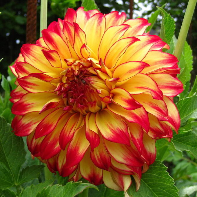 Георгин Леди Дарлин — впечатляющий декоративный сорт с крупными «тарелкообразными» соцветиями. Цветки раскрываются кремово-жёлтыми или абрикосово-жёлтыми в основании, с яркими красно-малиновыми или томатно-красными кончиками и штрихами по краю лепестков — эффект будто лепестки «подрумянились» от солнца. По мере открытия соцветия оттенки могут меняться: сначала более тёплые кирпично-красные тона, затем раскрываются светлые внутренние лепестки с желтоватым или абрикосовым фоном.