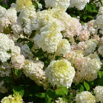 Гортензия метельчатая Diamantino. Этот сорт особенно интересен плотностью куста и обилием цветов. Куст имеет вертикальную, слегка расклешенную форму, средней высоты, не более 1,4 м и ширины 1,2 м. Побеги прямые, довольно жесткие, сорт не требует подвязки. Соцветия среднего размера: 20-30 см, очень плотные, густые метелки, состоящие из стерильных цветков. Отличается от других сортов метельчатой гортензии тем, что ее соцветия обладают сильно закругленной формой. В начале цветения сорт имеет удивительную желто-зеленую и золотистую окраску, затем чисто белую и к концу цветения лепестки окрашиваются в светло-розовый цвет. Зацветает довольно рано – с середины июня. Цветение обильное и продолжительное, вплоть до начала сентября.