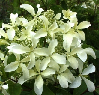 Высокорослый сорт, быстрорастущий и даже в контейнере достигает в высоту 2,5-3 м. Это один из наиболее оригинальных сортов гортензии метельчатой. Соцветия в форме небольшой кисти,длиной 15-25 см, состоят из цветков двух типов: стерильные -крупные, с удлиненными лепестками в форме «пропеллера», слегка закручены у основания, около 5 см в диаметре, а у основания кисти до 7-8 см, сидят на длинных цветоножках и, небольшие фертильные, их большинство: до 70-80%. Цветет с июля по сентябрь, чисто белыми, не меняющими окраску, цветками. Листья крупные, простые, зеленые, блестящие, немного морщинистые, овальной формы, с грубыми волосками по краю. Побеги светло-коричневые, грубые, очень прочные, толстые, прямые, ни при каких погодных условиях не требуют подвязки, хорошо держат форму куста. Думаю, что хорош был бы для использования в городских насаждениях, заслуживает более широкого применения в ландшафтном дизайне. Очень технологичный сорт, непритязателен в содержании как в открытом грунте так и в контейнере. Со