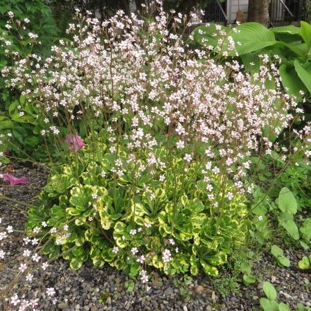 Листья светло-зеленые с желтыми пятнами, собраны в розетки, образуют плотную подушку. Цветки белые с розовым центром, в рыхлых длинных соцветиях. Растение высотой до 10 см и во время цветения до 30 см. Цветет в мае-июне. Разрастается быстро.