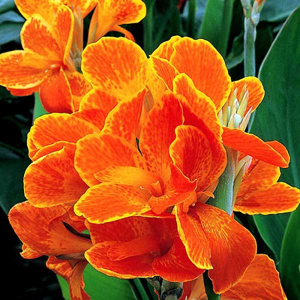 Канна Carnaval (низкорослая) — описание и характеристики сорта: высота растения: от 60 см; цветок: в диаметре 5-10 см; окрас: лепестки насыщенного оранжевого цвета по краю окаймлены желтой полоской; период цветения: июль-сентябрь; посадка в открытый грунт: начало июня; участок: солнечный, защищенный от сквозняка; почва: плодородная, хорошо дренированная; глубина посадки: 10 см; расстояние между клубнями: 30 см; полив: обильный; выкопка канн: корневища выкопайте в середине осени, просушите, храните в песке, торфе в сухом подвале или гараже