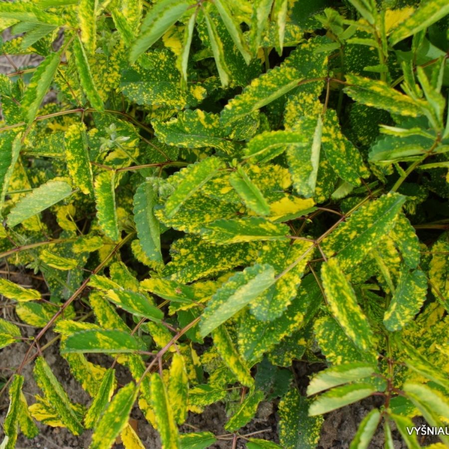 Листья: зубчатые, блестящие, вариегатные листья: на зелёном фоне неравномерный лимонно-жёлтый крап.