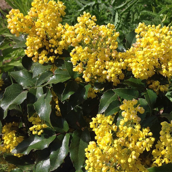 Mahonia aquif. 'Apollo' . Родина-запад Северной Америки. Достаточно засухоустойчива. Вечнозеленый кустарник до 1,5 м высотой. Интересный прежде всего крупными, кожистыми, блестящими непарноперистыми листьями: при распускании красноватых, летом — темно-зеленых, осенью — красновато-золотисто-бронзовых, особенно на солнечных местах. Листочки сложного листа по форме напоминают листья падуба. Цветки желтые, многочисленные, в прямостоячих, сильно разветвленных соцветиях на концах побегов. Зацветает в начале мая и цветет в течение месяца, иногда вторично цветет в октябре. Продолговато-эллиптические, темно-синие с сизым налетом, съедобные, кисло-сладкие плоды до 1 см, созревают в начале августа, придавая кусту неповторимое своеобразие. В Европе наиболее популярен сорт "Аполло", который получен в Голландии в 1973 году. Высота и диаметр кроны 0,6 -1 м, крона компактная. Листья сложные, до 30 см длины, состоят из 5 - 7 листочков с острыми зубчиками, летом листья темно-зеленые, в августе - бронзовые. Цветет в мае.