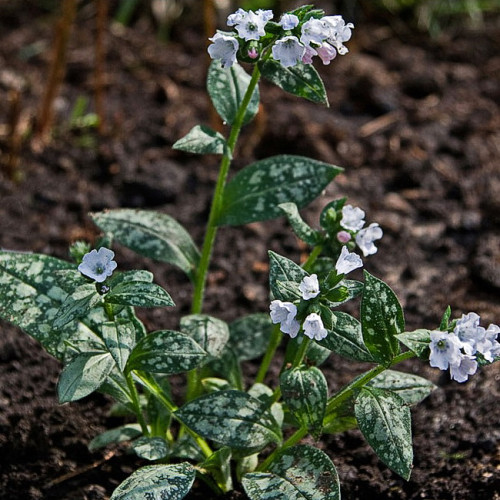Pulmonaria hybridum "Opal" - Медуница гибридная "Опал" Высота до 30см. Листья темно-зеленые с серебристыми пятнами, образуют аккуратную куртину; сохраняют декоративность в течение всего сезона. Со временем разрастается большими коврами. Цветение обильное, соцветия крупные. Цветки светло-голубые с розовинкой, трубчатые. Период цветения - май. Предпочитает полутенистые и тенистые места, рыхлую, влажную, достаточно питательную почву. Морозо- и зимостойка. Дает обильный самосев. Используется для групповых посадок, в миксбордерах, бордюрах, как почвопокровное растение для тенистых участков, в лесных композициях.