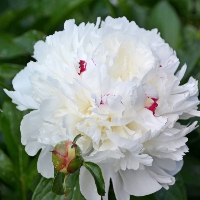 Цветок густомахровый, плотный, чисто-белый, в центре на кончиках лепестков метки красного, диаметром 20 см.