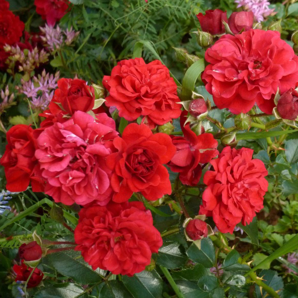 Роза Хеллоу (малиновая) почвопокровная - Куст вырастает компактных размеров, диаметром 1 м и высотой 50 – 60 см. Он густо покрыт цветами, поэтому напоминает пестрый ковер. Цветки пурпурно-красные, шириной 5 – 6 см. Все они собраны в кистевидные соцветия по 5 – 10 штук. Цветение продолжительное и обильное. Аромат легкий и ненавязчивый. Листья у розы блестящие, насыщенно-зеленые.