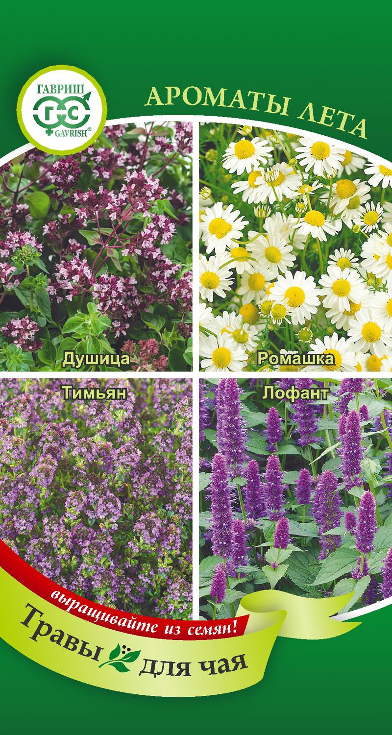 Семена Травы для чая Ароматы лета. Растения, вошедшие в состав, придают чаю неповторимый вкус и изысканный аромат, напоминающий о теплом и солнечном лете. Их легко и удобно выращивать на даче, они всегда под рукой: свежие летом или засушенные на зиму. Ромашка обладает успокаивающим, антисептическим действием, имеет цветочный аромат и горьковато-пряный вкус. Листья и цветы лофанта имеют сильный, мятно-анисовый аромат и сладковатый вкус. Это уникальное растение избавит от сезонной усталости, улучшит общее состояние организма. Чабрец (тимьян) отличается удивительно-ярким запахом и при добавлении в чай оказывает тонизирующий, иммуномодулирующий эффект. Своими полезными, общеукрепляющими свойствами славится душица, ее свежий аромат взбодрит и поднимет настроение на целый день.