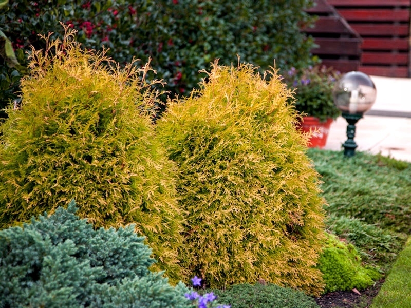 Туя западная "Рейнголд" (Thuja occidentalis Rheingold) - медленнорастущий густой кустарник, достигающий около 130 см высоты. В молодом возрасте форма кроны шаровидная, позже — яйцевидная. Хвоя интенсивно-желтой окраски, зимой коричневая. Ветви тонкие, диморфные, частично игольчатые, частично чешуевидные.